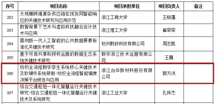 2023年12月18日,浙江省科學(xué)技術(shù)廳發(fā)布了《關(guān)于2024年度“尖兵”“領(lǐng)雁”研發(fā)攻關(guān)計(jì)劃項(xiàng)目立項(xiàng)的公示》,對(duì)608項(xiàng)擬立項(xiàng)的2024年度“尖兵”“領(lǐng)雁”研發(fā)攻關(guān)計(jì)劃項(xiàng)目(含省甬聯(lián)動(dòng)項(xiàng)目)予以公示,浙江臺(tái)華新材料股份有限公司“紡織全流程數(shù)字孿生系統(tǒng)核心關(guān)鍵技術(shù)及軟硬件系統(tǒng)研制-紡織全流程智能調(diào)度決策平臺(tái)研發(fā)與應(yīng)用”獲得浙江省2024年度“領(lǐng)雁”研發(fā)攻關(guān)計(jì)劃項(xiàng)目立項(xiàng)。