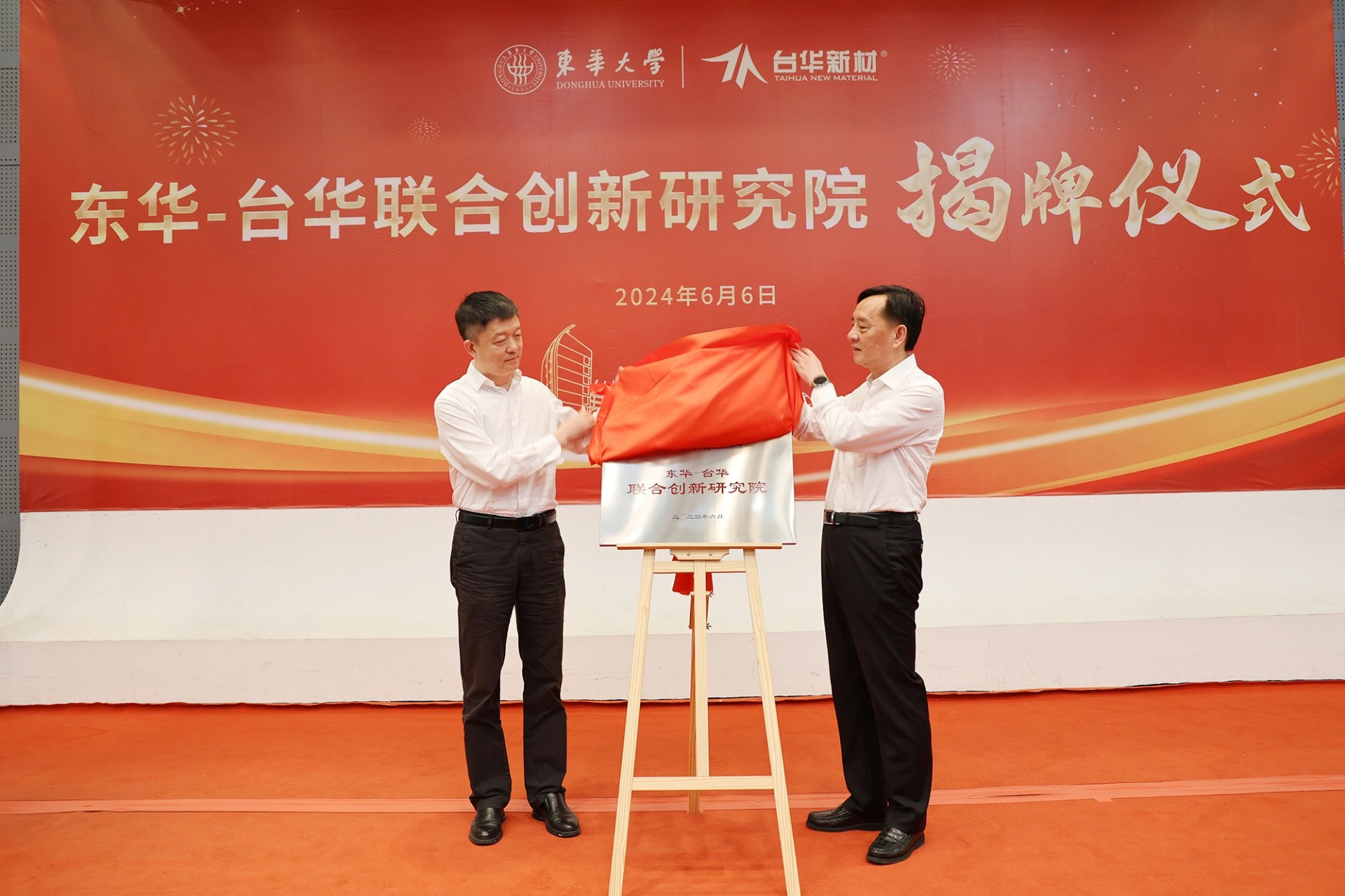 浙江臺華新材料集團股份有限公司代表,東華大學相關部門負責人、院系代表見證“東華—臺華聯(lián)合創(chuàng)新研究院”揭牌。